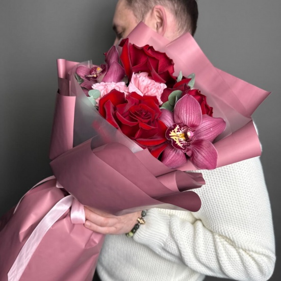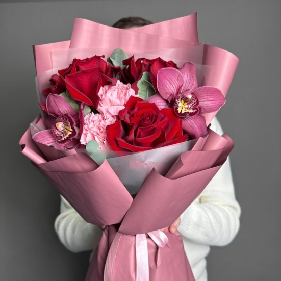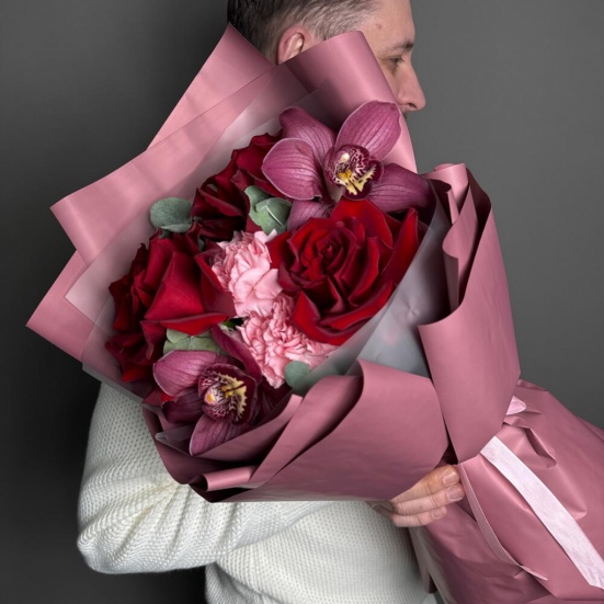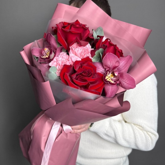 Букет из 3 красных роз, орхидей и диантуса в Дмитрове